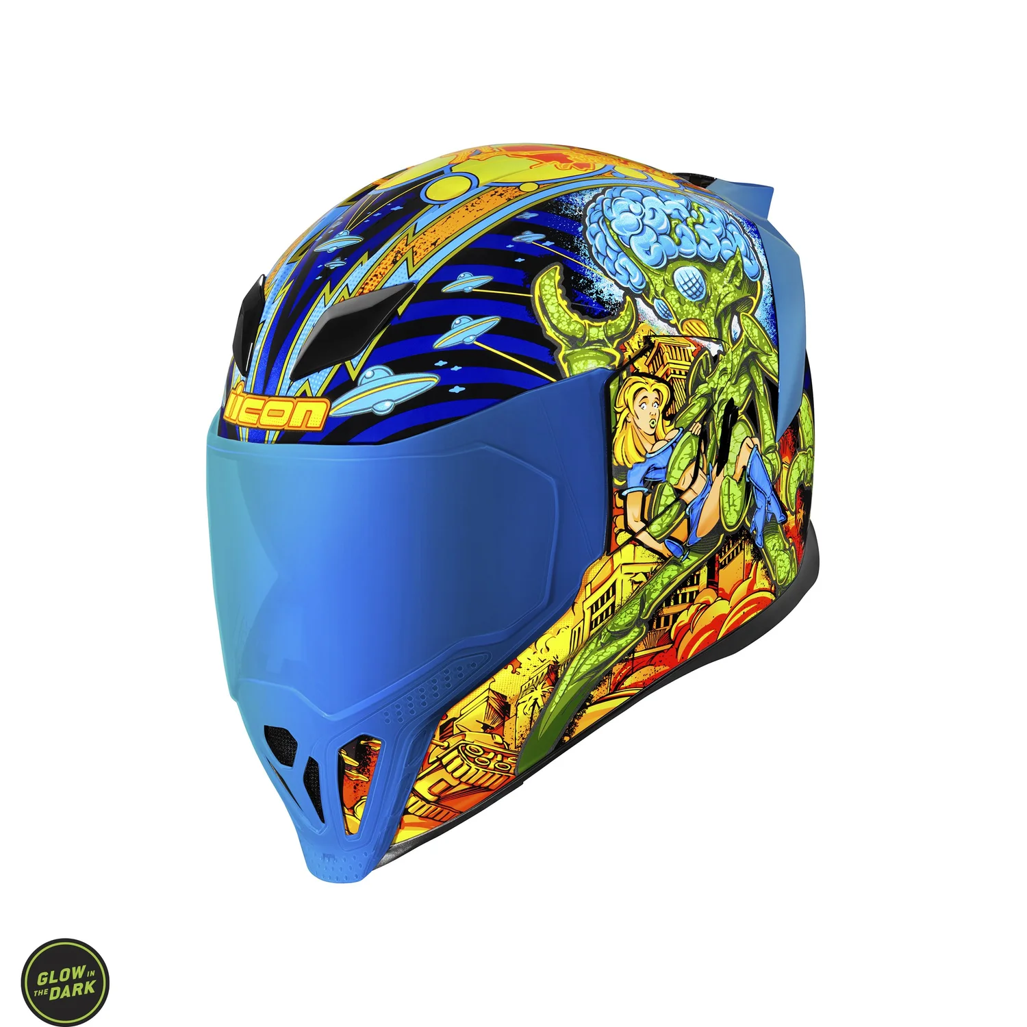 Why watch a B horror movie when you can star in your own? Prepare for your invasion with this glow-in-the-dark attack lid. The ICON Airflite Bugoid Blitz Helmet is ECE22.06 certified, making the durable injection-molded polycarbonate shell as tough as a bug’s exoskeleton. The fog-free Forceshield and internal DropShield give you a clear view of the battle—and the street—in any kind of lighting.