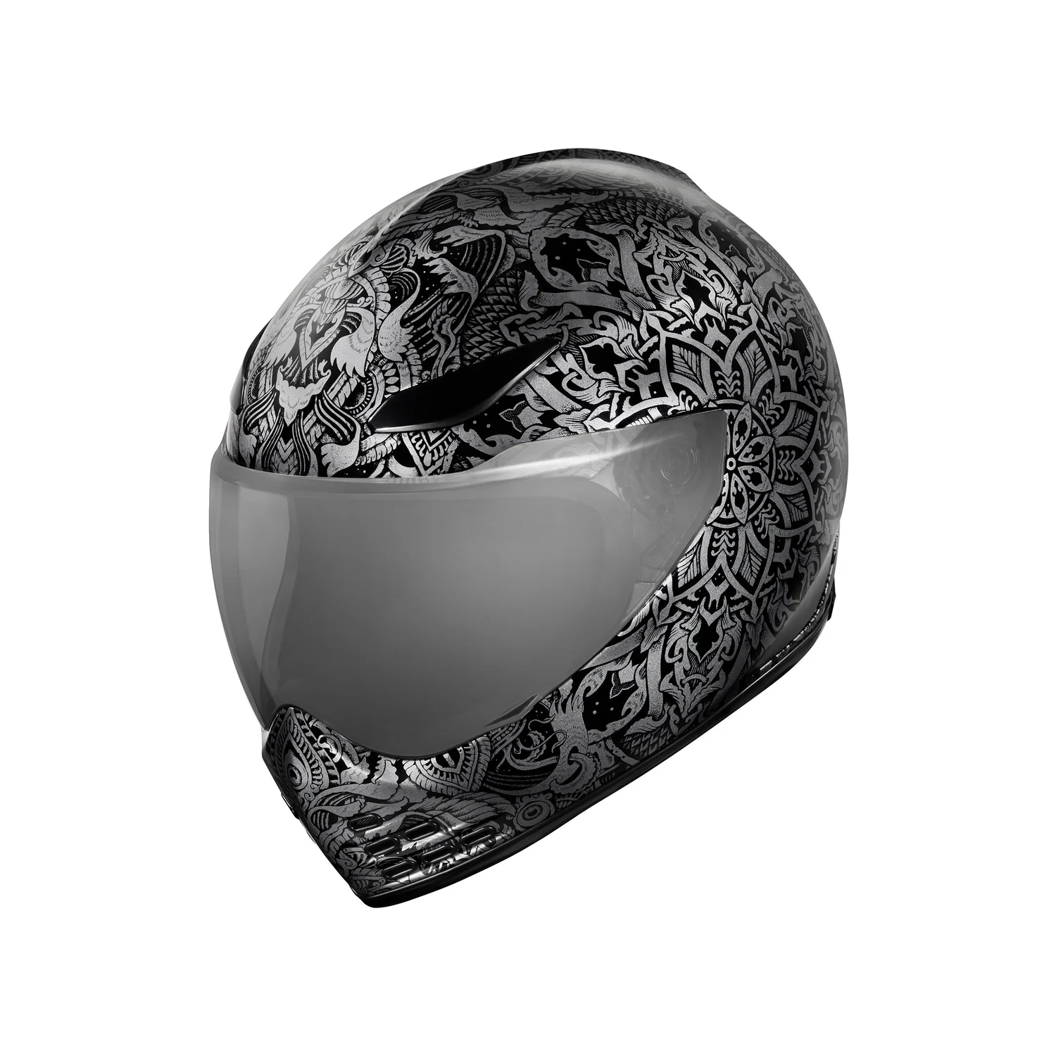 Warp storms and chaos demons keep a watchful eye on the cryptic mandala swirls. The ICON Domain Gravitas is a premium full-faced helmet that features a hand-crafted FRP shell for maximum integrity with minimal weight. In addition, a prominent dorsal ridge, large brow-mounted intake vents, and channeled EPS provide increased ventilation within the helmet. This increased ventilation greatly enhances rider comfort when paired with the removable Hydradry liner and removable chin curtain. The Domain Gravitas includes a color-matched Domain Shield in RST silver and a fog-free clear Domain Shield. In addition, the Domain is also compatible with ICON’s HelmLink Bluetooth communications system, which seamlessly integrates with the helmet (sold separately).