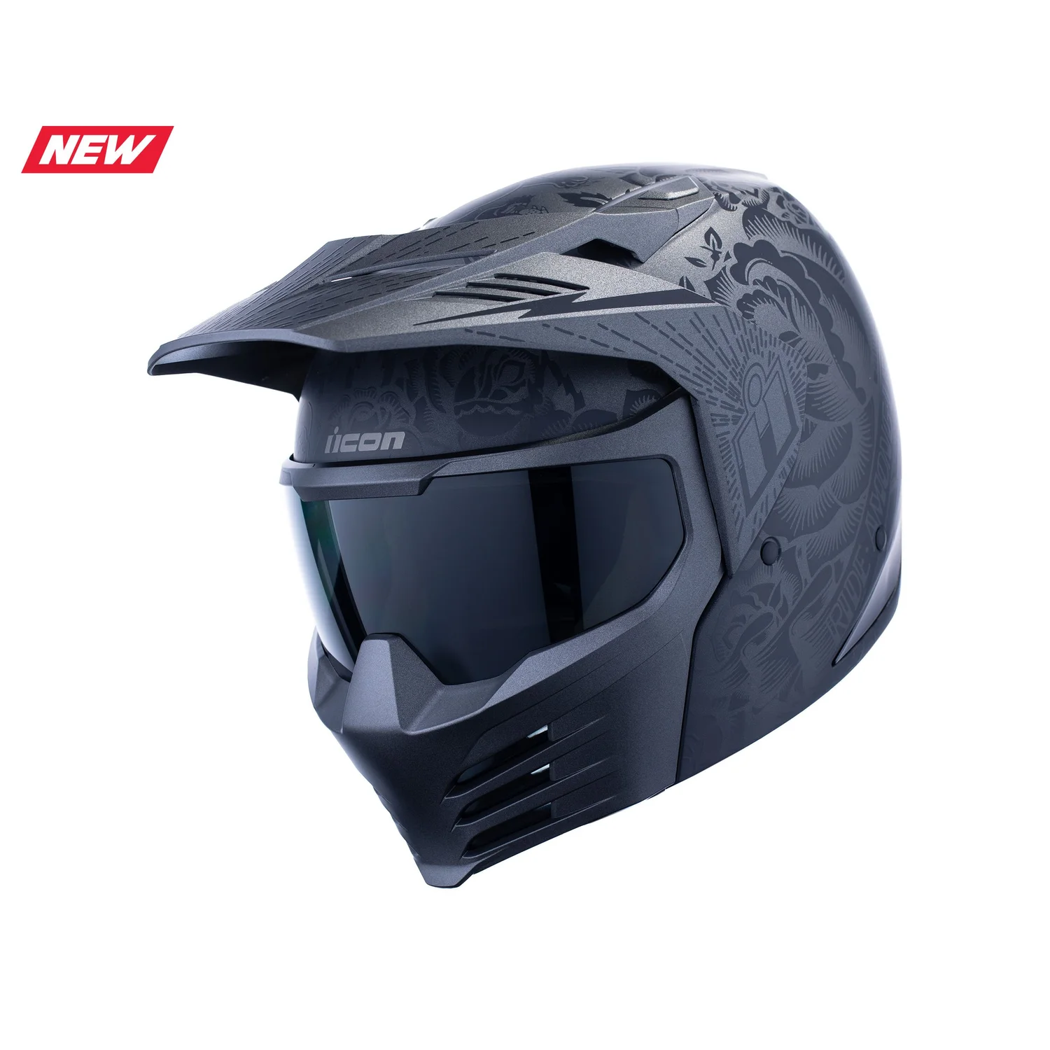 The Elsinore Darkgard is what happens when outlaw soul meets modular tech. This is a blacked-out, metallic beast born to haunt highways and back alleys alike. “Ride Among Us” snakes through a field of Americana roses, echoing classic rockabilly tattoo art across the handcrafted fiberglass shell. The modular faceplate lets you ride buttoned-up or bare-fanged, while the Fog-Free Limotint MXShield™ gives that low-profile menace with max visibility—and it comes installed. Rock the greaser’s ghost, all metallic menace and midnight intentions.