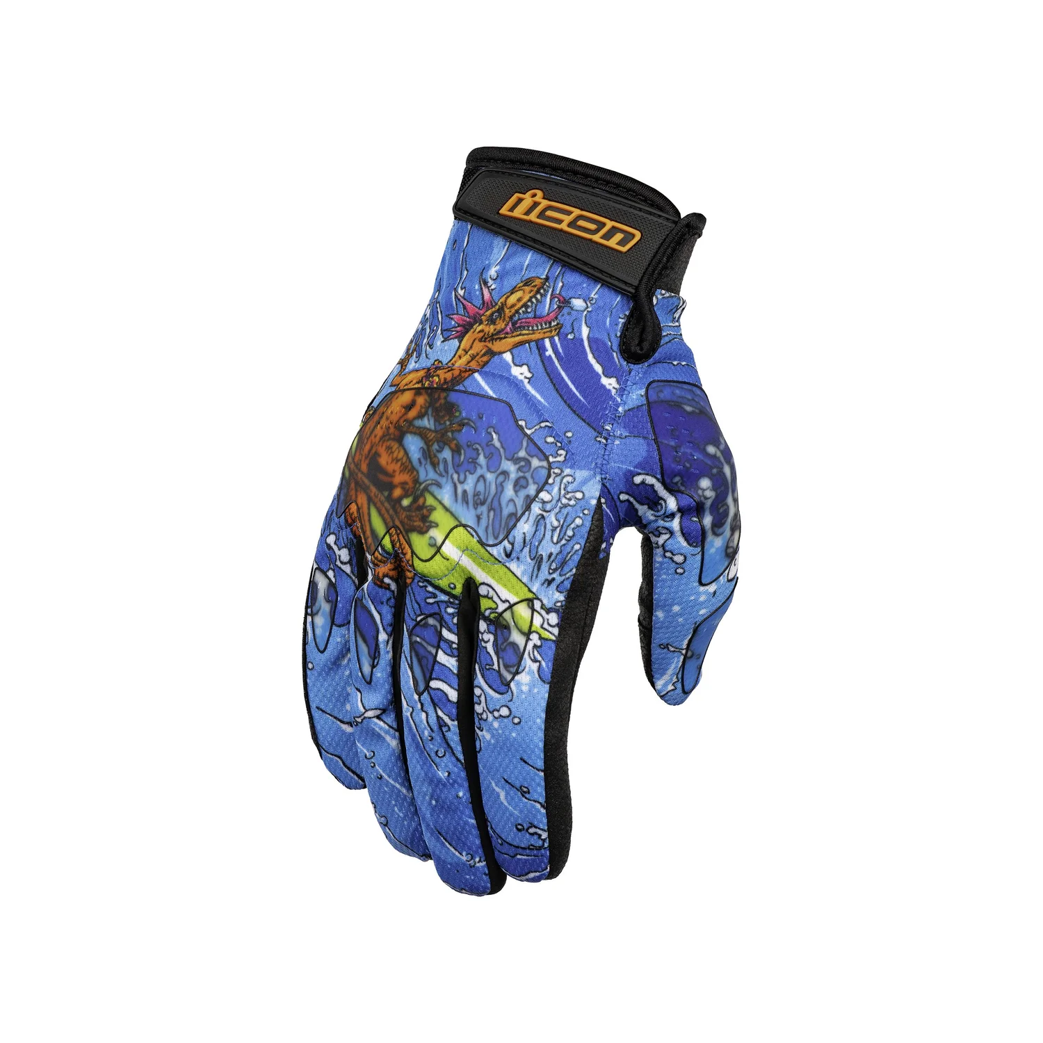 Surf’s up… way up! When the asteroid hit the Gulf of Mexico millions of years ago, the coolest dinosaurs rode a wave all the way to extinction. Wipeouts are inevitable, so the Hooligan Dino Fury Glove has internal padding on the knuckles and an Ax Laredo palm for leather-like performance. A polyester mesh backhand keeps you as cool as a surfing dino, and the Velcro wrist closure means a secure fit.