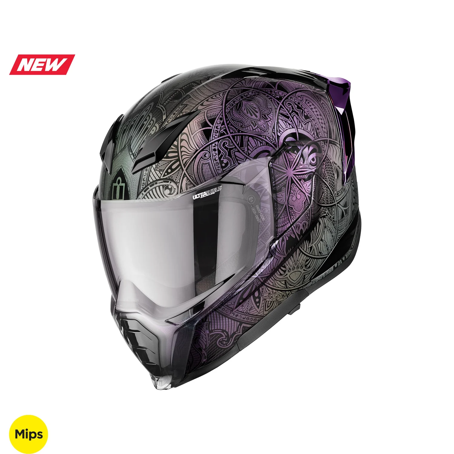 The ULTRAFLITE™ Opal Mandala channels chaos into clarity with its hypnotic mandala-inspired geometric graphic layered in ICON’s color-shifting Opal paint, shifting hues like thought in motion. Beneath the enlightened surface lies a handcrafted FRP shell, engineered for lightweight strength and certified to DOT FMVSS 218 and ECE R22.06 standards. Stay cool and focused with oversized intake and exhaust ports, a recessed twin-channel Speedwing™ Supervent system, and a Hydradry™ comfort liner with Ax® Suede for long-ride luxury. Vision is controlled through a quick-change ULTRASHIELD™ and fog-free Dropshield Ultra™, activated by an exterior switch for on-the-fly transitions. Add the optional HELMLINK™ Bluetooth® system (sold separately) to stay connected while you seek the fast path to self-discovery.